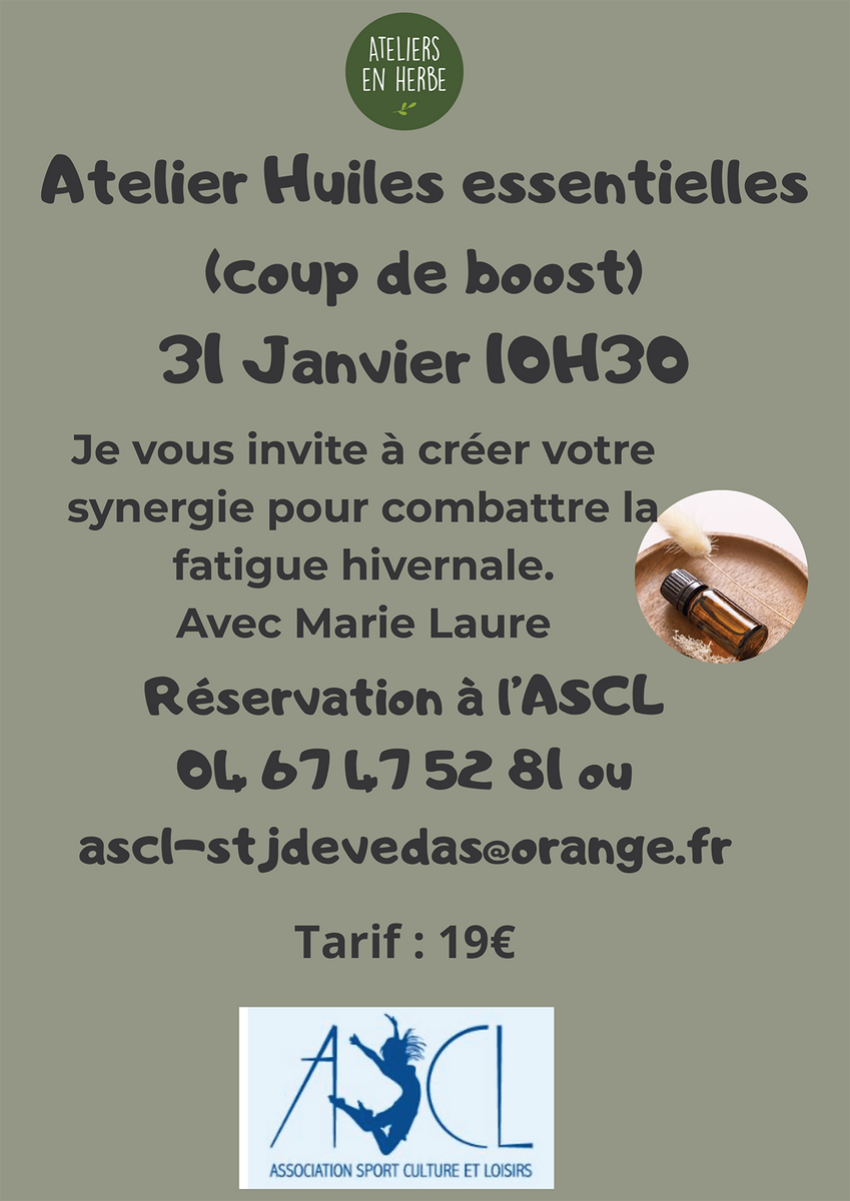 Samedi 24 janvier, l’ASCL organise un stage "Se booster aux huiles essentielles" de 10h30 à 11h30.